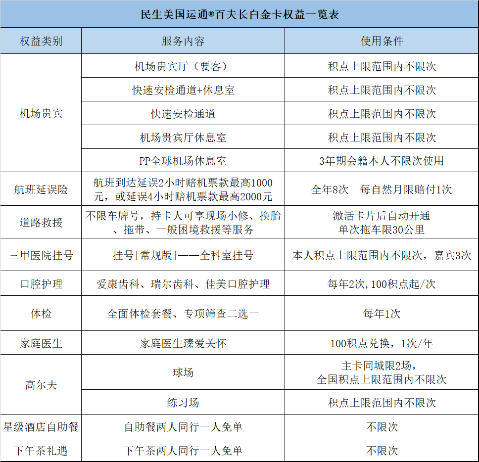 - 积点兑换:机场VIP贵宾(要客)、机场贵宾、快速安检、高铁贵宾厅、高尔夫、游泳、健身、羽毛球、滑冰、体检、家庭医生、专家挂号、洗牙等