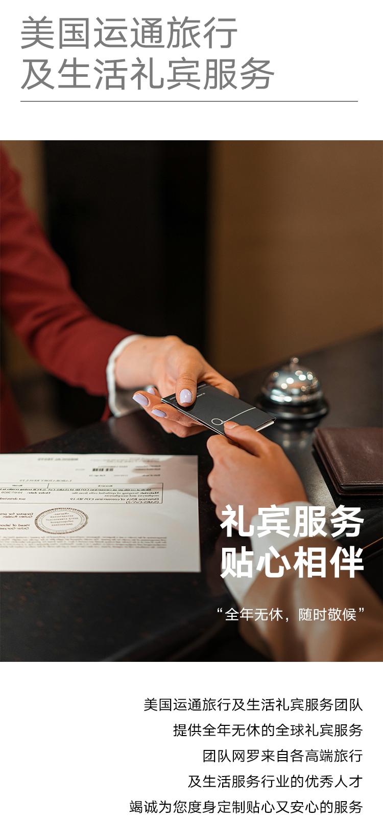 运通的礼宾服务一直非常出名,无论你是想安排异常期待已久的旅行,还是预订心仪的餐厅与家人共享美宴,或是为朋友准备一份精美礼物,一个电话,礼宾团队都会用心为你策划和安排。